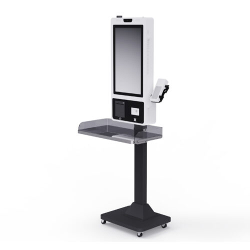 Kiosk with a tray adds practical functionality by providing a surface for receipts, documents, or temporary item placement. This design is ideal for ticketing, banking services, self-check-in, and queuing systems, improving user convenience during operation.